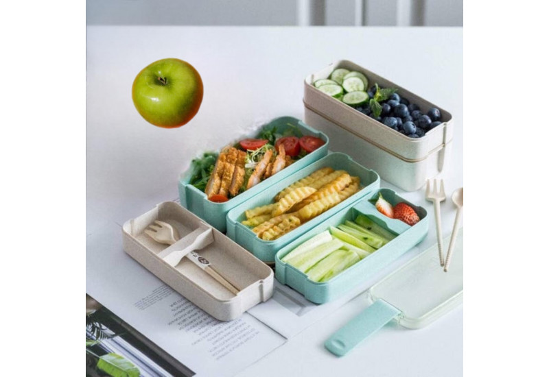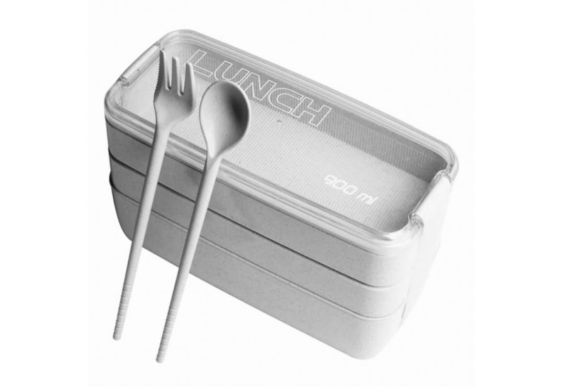 Une Boîte à bento écologique et éco-responsable en paille de blé avec cuillère et fourchette.